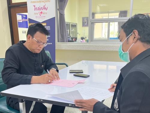 นายประโมทย์ ดำจวนลม พัฒนาการจังหวัดสุราษฎร์ธานี พร้อมด้วยนางสาวทิพย์สุคนธ์ ปิ่นสมนาม ผู้อำนวยการกลุ่มงานประสานและสนับสนุนการบริหารงานพัฒนาชุมชน และเจ้าหน้าที่กองทุนพัฒนาบทบาทสตรี ดำเนินการไกล่เกลี่ยก่อนฟ้องสมาชิกกลุ่มลูกหนี้กองทุนพัฒนาบทบาทสตรี จังหวัดสุราษฎร์ธานี