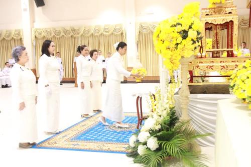 ทั้งนี้นายจุมพฏ วรรณฉัตรสิริ ผู้ว่าราชการจังหวัดสุราษฎร์ธานี เป็นประธานในพิธีฯ พร้อมด้วยนางวีณา วรรณฉัตรสิริ ประธานแม่บ้านมหาดไทยจังหวัดสุราษฎร์ธานี รองผู้ว่าราชการจังหวัดฯ หัวหน้าส่วนราชการ ทหาร ตำรวจ ข้าราชการ พนักงานของรัฐ องค์กรเอกชน และประชาชนทุกหมู่เหล่าร่วมพิธีวางพานพุ่มดอกไม้ฯ รวมทั้งสิ้นจำนวน 111 หน่วยงาน ซึ่งต่างน้อมรำลึกถึงพระมหากรุณาธิคุณอย่างหาที่สุดมิได้