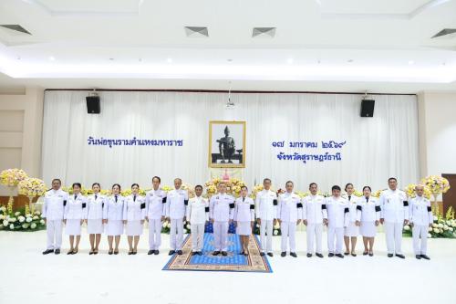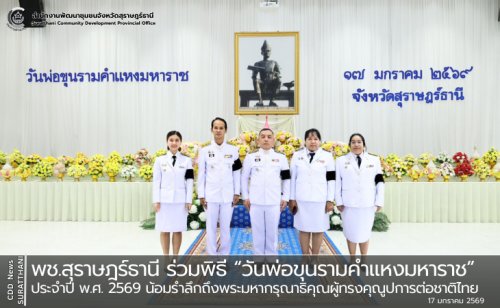 นายพิชัย มณีลาภ พัฒนาการจังหวัดสุราษฎร์ธานี พร้อมด้วยนางสาวทิพย์สุคนธ์ ปิ่นสมนาม ผุ้อำนวยการกลุ่มงานประสานและสนับสนุนการบริหารงานพัฒนาชุมชน และเจ้าหน้าที่กลุ่มปฏิบัติภารกิจงานพระราชพิธี รัฐพิธี ที่ 4 ร่วมพิธี “วันพ่อขุนรามคำแหงมหาราช” ประจำปี พ.ศ. 2569 ณ อาคารศูนย์กลางการประชุมสัมมนาภาคใต้ตอนบน อำเภอเมืองสุราษฎร์ธานี โดยมีนายจุมพฏ วรรณฉัตรสิริ ผู้ว่าราชการจังหวัดสุราษฎร์ธานี เป็นประธานในพิธี พร้อมด้วยนายจักรกฤษณ์ ฝั่งชลจิตร์ รองผู้ว่าราชการจังหวัดสุราษฎร์ธานี ส่วนราชการ ทหาร ตำรวจ หน่วยงานภาครัฐ องค์กรปกครองส่วนท้องถิ่น เหล่ากาชาดจังหวัด และพสกนิกรชาวจังหวัดสุราษฎร์ธานีเข้าร่วมพิธีฯ ในครั้งนี้