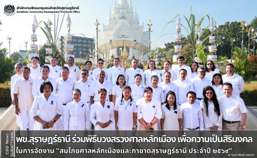 นายพิชัย มณีลาภ พัฒนาการจังหวัดสุราษฎร์ธานี มอบหมายนางสาวทิพย์สุคนธ์ ปิ่นสมนาม ผู้อำนวยการกลุ่มงานประสานและสนับสนุนการบริหารงานพัฒนาชุมชน ร่วมพิธีบวงสรวงศาลหลักเมือง เพื่อความเป็นสิริมงคลในการจัดงาน "สมโภชศาลหลักเมืองและกาชาดสุราษฎร์ธานี ประจำปี ๒๕๖๙" ณ บริเวณศาลหลักเมือง จังหวัดสุราษฎร์ธานี โดยมีนายจุมพฏ วรรณฉัตรสิริ ผู้ว่าราชการจังหวัดสุราษฎร์ธานี เป็นประธานฯ พร้อมด้วยรองผู้ว่าราชการจังหวัดฯ หัวหน้าส่วนราชการ นายอำเภอ ข้าราชการ ผู้บริหารหน่วยงานภาครัฐ ภาคเอกชน และพ่อค้าประชานทุกภาคส่วน ร่วมพิธีบวงสรวงศาลหลักเมือง เพื่อความเป็นสิริมงคลในการจัดงาน "สมโภชศาลหลักเมืองและกาชาดสุราษฎร์ธานี ประจำปี ๒๕๖๙" ซึ่งจังหวัดสุราษฎร์ธานี ร่วมกับเหล่ากาชาดจังหวัด หน่วยงานภาครัฐ ภาคเอกชน และผู้เกี่ยวข้องทุกภาคส่วน กำหนดจัดงานสมโภชศาลหลักเมืองและกาชาดสุราษฎร์ธานี ประจำปี ๒๕๖๙ ระหว่างวันที่ ๕–๑๔ กุมภาพันธ์ ๒๕๖๙ ณ บริเวณริมเขื่อนแม่น้ำตาปี อ.เมืองฯ จ.สุราษฎร์ธานี เพื่อจัดหารายได้สมทบทุนเหล่ากาชาดจังหวัดสุราษฎร์ธานี นำไปบรรเทาทุกข์บำรุงสุขแก่ประชาชนที่ประสบปัญหาความเดือดร้อน และส่งเสริมเผยแพร่ศิลปวัฒนธรรมประเพณีอันดีงามของจังหวัด